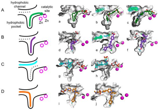 Schematic representation of the autotaxin (ATX) binding pocket and the different inhibitor binding modes reported to date. (This figure is cited from the reference 22) Type I, II, III, and IV inhibitors are represented in green, purple, cyan, and orange, respectively, on the schema with matching colors for carbon atoms on the exemplified structures. The gray dotted lines represent secondary ligands modeled next to the inhibitor as shown with gray carbons on the illustrations. Zinc ions are depicted in magenta. (A) Binding mode of type I inhibitors LPA (lysophosphatidic acid) 22:6 (a), HA-155 (b), and “compound 2”(c). (B) Binding mode of type II inhibitors PAT-494 (d), PAT-078 (e), and CRT0273750 (f). (C) Binding mode of type III inhibitors PAT-343 (g) and tauroursodeoxycholic acid (h). (D) Binding mode of type IV inhibitors GLPG1690 (i) and compound 9 (j).