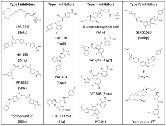 Chemical structures of representative ATX inhibitors. PDB codes of co-crystallized structures with ATX are indicated in brackets.