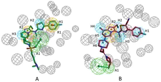 (A) All chemical features identified based on the 5M7M complex. (B) All chemical features identified based on the 5MHP complex. Feature colors: blue, hydrophobic feature; green, hydrogen acceptor feature; orange, aromatic ring feature.