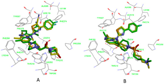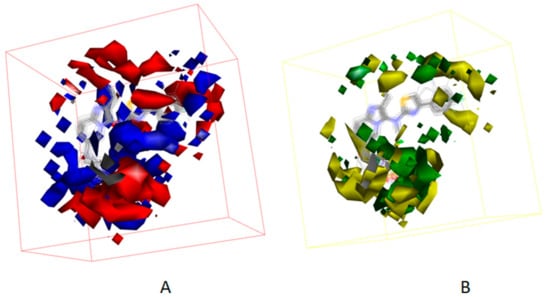 (A) 3D QSAR model coefficients on electrostatic potential grids. Blue represents positive coefficients; red represents negative coefficients. (B) 3D QSAR model coefficients on van der Waals grids. Green represents positive coefficients; yellow represents negative coefficients.