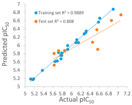 For the purpose of obtaining a structure–activity relationship profile on the compound N-N,4-dimethylthiazol-2-amine derivates as ATX inhibitors and of retrieving potential ATX inhibitors through the VS way, we built 3D QSAR models. The greatest 3D QSAR model was utilized to evaluate the pIC50 values of new compounds. In the above work, 31 ATX inhibitors bearing the same scaffold, as shown in Figure 5A, with experimental IC50 values were gathered as the 3D QSAR dataset. The “Generate Training and Test Data” protocol in Discovery Studio 3.1 was applied to generate the training and test sets by using the “random” method. Take into consideration, a good alignment of compounds used for QSAR modeling is important for molecular field analysis, and the whole 34 compounds were docked into the ATX’s active site to probe each compound’s probable binding conformation, and three compounds were deleted after checking their binding conformations since these compounds possessed obviously wrong binding conformations. Then, the remaining 31 compounds which have binding conformations were superimposed by utilizing the “Molecular Overlay” tool, and the 3D QSAR model was developed by making use of the 31 aligned inhibitors. Figure 5B presents the alignment result of the 31 ATX inhibitors. The correlation coefficient r2 between estimated and experimental activity of the training set was identified as 0.988, while the correlation coefficient r2 of the test set was identified as 0.808, manifesting that the established 3D QSAR model was an excellent model for exploring the QSAR of the 31 inhibitors. Figure 6 shows the good agreement between predicted pIC50 values and experimental pIC50 values for both the test set and training set.