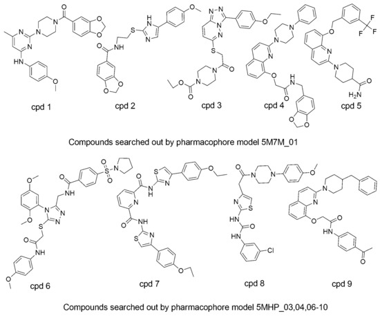 In order to find patent ATX inhibitors, we conducted a combined virtual screening method, including a 3D QSAR model, molecular docking calculations, and pharmacophore models [27]. Figure 8 manifests the virtual screening workflow. Using the PB-VS filter, the original chemical database was first filtered, for PB-VS was quicker than DB-VS. Nevertheless, the pharmacophore models which were utilized in the research only thought of the chemical properties between the receptor and the ligand, and these models did not have the capacity to estimate the inhibitory activities of the potent compounds. Consequently, the hit compounds retrieved by PB-VS were docked to the active site of ATX receptor for sorting these compounds and discovering rational binding conformations of those compounds to do some preparation for the activity prediction by the 3D QSAR model. It should be emphasized that the 14 pharmacophore models applied in the research are non-quantitative structure–activity relationship pharmacophore models, and those models do not involve the activity-relationship of the ATX inhibitors and cannot evaluate activity of patent compounds. Thus, the 3D QSAR model, which can predict the inhibitory activity of new compounds, was finally applied to filter the selected compounds passing through the two rounds of selection, which includes DB-VS and PB-VS. In detail, when the cutoff fitting value is assigned as 2.0, 2846 compounds could get over the PB-VS, and the 2846 compounds could be sorted by utilizing the docking computation. On the basis of the docking scores and whether there are some significant mutual effects existing between the selected compounds and the ATX protein’s active position (including PHE211, LEU214, PHE274, PHE275, ALA305274, and TYR307), 50 compounds were selected. Then, the 3D QSAR model was used to filter 50 compounds which have probable binding conformations, and nine compounds were selected whose estimated pIC50 values were higher than 5.6. Figure 9 manifests the chemical structures of the nine chosen compounds. Table 4 stands for the nine hit compounds’ relevant parameters, which includes pharmacophore fit values, docking scores, and pIC50 values.
