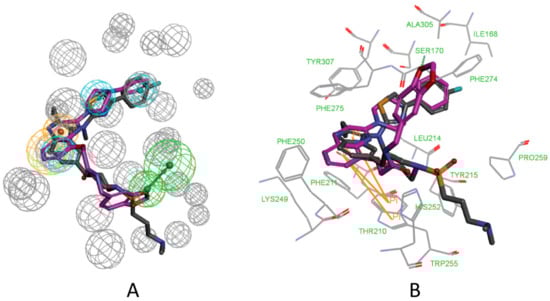 The mappings of cpd4 with isosurface-EP (–, red; +, blue) (A), isosurface-VMD (–, yellow; +, green) (B) grids. cpd4 is presented in purple stick form. Compound 7HR complexed with autotaxin is also shown for comparison (in gray stick form).