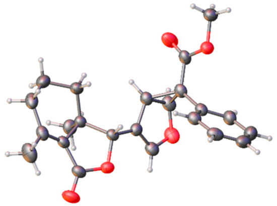 With acceptor diazoesters (2a–2c) in hand, fraxinellone (1) as a starting brick was converted into the corresponding monocyclopropanated adducts (3a–3c). Rh2(OAc)4-catalyzed cyclopropanation of 1 mainly provides stereoselective adducts by thin-layer chromatography (TLC) isolation. The absolute configuration of 3a was unambiguously established by X-ray crystallography (Figure 2), indicating the cyclopropyl ring of 4’ and 5’ positions was formed in β configuration of the furan ring. Formation of this product can be rationalized on steric ground in the asynchronous concerted cyclopropanation that the reaction of the Rh-bound carbene occurs from the si face of the carbene [27,28]. Using the same orientation of attack, the observed stereochemistry is consistent with the attack occurring at the β-position for 3b and 3c in NOE spectra. Furthermore, the configuration of 3a indicated the top chiral carbon of the cyclopropyl ring oriented the ester group onto the convex face of the bicycle, which is same as synthetic methodology [29]. Unfortunately, the yields were too low (10–37%), with just 50–60% conversion of diazoesters and about 70% conversion of fraxinellone, perhaps because of the complexity of the fraxinellone structure. The structures of all analogues were determined by NMR and HRMS and were stable for at least five days in solid or in acetone solution at room temperature. Their spectra can be found in the Supplementary Materials.