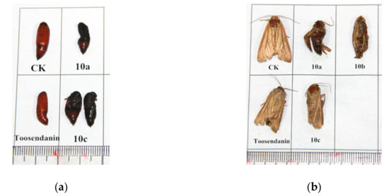 Representative malformed pictures: (a) Malformed pupae of 3a (10a) and 3c (10c) during the pupation period; (b) malformed moth of 3a (10a), 3b (10b) and 3c (10c) during the stage of adult emergence (CK = blank control group, toosendanin = positive control group).