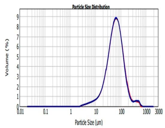 The main aim of this study was to develop silk fibroin carboplatin microparticles as a platform for targeted drug delivery using the ionic gelation method. Although other methods have been used to encapsulate carboplatin, there were no readily available data in regards to encapsulating the drug using the ionic gelation method. The SFCP microparticle size distribution analysis was carried out by Mastersizer within the size range of 0.02–2000 µm with normal sensitivity and 12.24% obscuration. The concentration of the SFCP microparticles was 0.0728% volume. Volume weighted and surface weighted mean values are listed on Table 1 as 40.629 µm and 79.695 µm, respectively.