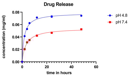 The cumulative drug release was measured for over 48 h at different pH for the synthesized particles using the ionic gelation method as shown in Figure 6. The particles showed an initial burst release of the drug and subsequently stabilized over time. There was a release of a higher concentration of the drug in acidic pH. The characteristic burst release with subsequent normalization of the concentration from particles is consistent with the findings of Perez and colleagues [30]. These results corroborate with the study performed by Subia et al. [25] and suites the profile for candidate anticancer treatment modality since the cancer microenvironment is said to be acidic.
