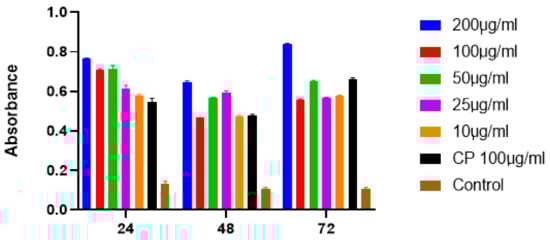The absorbance data were analyzed by using the Student’s t test and one-way ANOVA. These results show the incubation of SFCP on MCF-7 cell lines at time intervals of 24, 48, and 72 h at 450 nm absorbance. SFCP particles prepared by the ionic gelation method showed significant apoptotic activity at a 95% confidence interval when compared with the control (Figure 7). There were no significant differences amongst different incubation times. This may indicate a sustained activity of the drug over the 72-h period. The IC50 of SFCP particles was 9.23 µg/mL (graphpad prism version 8).