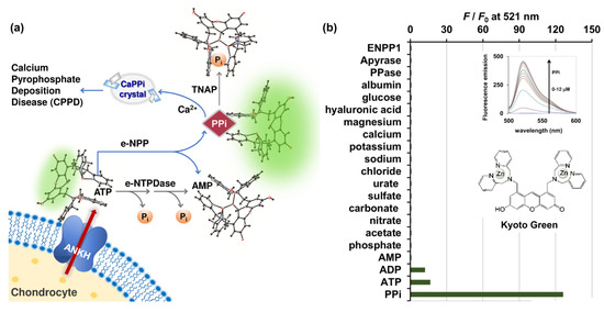 (a) Schematic illustration of ATP conversion pathways occurring in biological synovial fluid differentiated using PPi-specific Kyoto Green; (b) Selectivity of Kyoto Green (1 μM) towards various ions (2 μM), hyaluronic acid (3 mg/mL), glucose (3 mg/mL), albumin (20 mg/mL), PPase (0.4 ng/μL), apyrase (4 ng/μL), and ENPP1 enzymes (1 ng/μL) commonly found in biological synovial fluids. Measurement conditions: 50 mM HEPES buffer, 10 mM NaCl, 1 mM MgCl2 (pH 7.4, 25 °C, λex = 488 nm); (inset, top) Fluorescence emission change of Kyoto Green upon addition of PPi; (inset, bottom) chemical structure of Kyoto Green.