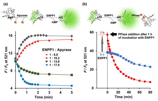 (a) Competitive catalytic activity of ENPP1 (0.734 ng/μL) and apyrase (5.0, 7.5, 10.0 and 12.5 ng/μL) toward 5 μM ATP monitored in real time by 1 μM Kyoto Green; (b) Catalytic activity of ENPP1 (1.1 ng/μL) when 50 μM of ATP was used as a substrate. PPase (0.03 ng/μL) was added at 0 (blue square) and 1 h (red circle) after ENPP1 addition. Measurement conditions: 50 mM HEPES buffer, 10 mM NaCl, 1 mM MgCl2 (pH 7.4, 25 °C, λex = 488 nm).