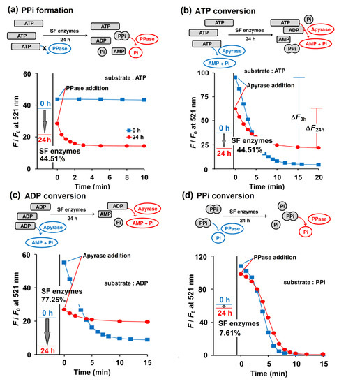 Enzymatic activities of SF No. 1 when 1 mM ATP (a, b), 1 mM ADP (c), and 1 mM PPi (d) were employed as a substrate, as reported by Kyoto Green (1 μM). The F/F0 values of Kyoto Green at 0th and 24th h after incubation of the substrate with SF, are displayed as a blue and red line, respectively. The incubated mixtures at 0th (blue square) and 24th h (red circle) were 100-fold diluted and further treated with 0.074 ng/μL PPase (a,d) and 0.33 ng/μL apyrase (b,c) then monitored by Kyoto Green (1 μM). Measurement conditions: 50 mM HEPES buffer (pH 7.4, 25 °C, λex = 488 nm).