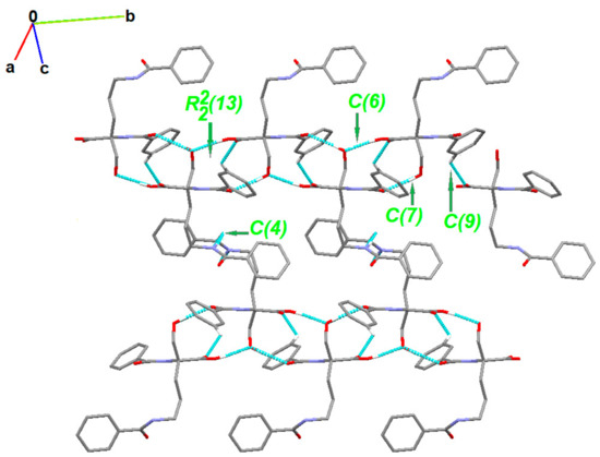 The partial crystal packing is shown in Figure S2. At the first level of the Graph Set Theory [92,93,94], basic synthons are as follows: C(7), namely motif a, via O2-H21…O1, C(6); motif b, via O4-H41…O2, C(4); motif c, through N2-H20…O5 as well as C(9) by C3-H3…O3 interactions. At the second level, the pairwise combination of those motifs gives longer chains: C22(9) (ab), C22(18) (bc) and C22(19)(ac). Motifs a and b jointly form a ring pattern with the R22(13) graph descriptor. Consequently, a chain of fused rings along the b-axis is generated. Additionally, C3-H3…O3 interaction is involved in the formation of long supramolecular chains C22 (13) and C22(15) (Figure 4 and Figure S3).