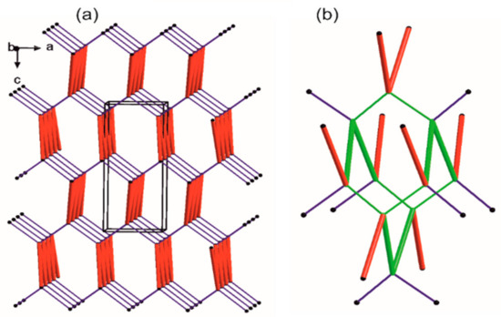 Following their H-bonds energies, those entities (Figure 5) are large synthons, Long-Range Synthon Aufbau Module (LSAM). The latter contain more than one type of intermolecular interactions combined with representative information on symmetry, long range order and overall topology of the crystal. They represent a more comprehensive approach than the basic synthon concept [95]. For motifs a and b, H-bond energies are of 5.34 and 7.16 kcal/mol, respectively. These energies are higher than that of the ribbon type, almost hexagonally packed motif c (2.75 kcal/mol). Both a and b motifs link molecules generated by the same symmetry operator [-x, -1/2+y, 3/2-z] and can be reduced to one connection in the simplified topological representation of the network. Moreover, each molecule can be reduced to a node that is graphically represented by a sphere of an arbitrary radius indicating the gravity center of a molecule (Figure 5).