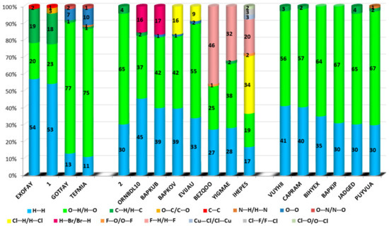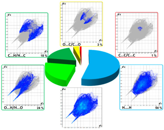 The C…O interactions were detected in 1 only while the O…O interactions are important for GOTFAY [99] and TEFMIA [100]. A summary of essential contacts and their relative contributions is shown in Figure 9 and summarized in Table S7. Finger plots are visualized in Figure S6. HS parameters are shown in Table S8.