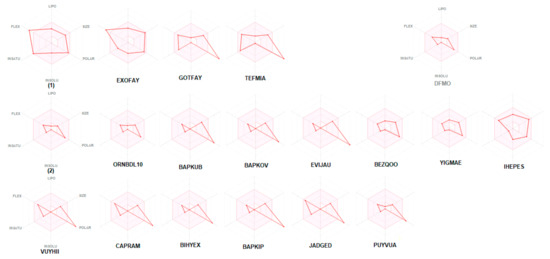 The bioavailability radars of studied compounds can be analyzed intuitively (Figure 11). These for SwissADME unique snapshots are the drug-likeness graphs, presented in the form of a hexagon with each of the vertices representing a parameter that defines a bioavailable drug. The pink regions represent the optimum range of the following six properties: lipophilicity (XLOGP3 between −0.7 and +5.0), size (MW between 150 and 500 g/mol), polarity (TPSA between 20 and 130 Å2), solubility (log S not higher than 6), saturation (fraction of carbons in the sp3 hybridization not less than 0.25) and flexibility (no more than nine rotatable bonds). Drug-likeness properties are represented by the red distorted hexagon within the pink shade. It was found that compound 1 is slightly outside the pink area on one side, due to the inconformity of flexibility. In some other cases, off-shoot of one of the vertices towards polarity is observed.