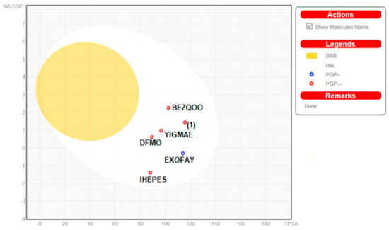 Moreover, the ADME properties in vivo were predicted with the graphical classification model, the Egan BOILED-Egg (Brain Or IntestinaL EstimateD) permeation predictive model diagram, including passive human gastrointestinal absorption (HIA), blood–brain barrier (BBB) permeation. All compounds have no BBB permeability. Nevertheless, 1 as well as BEZQOO, EXOFAY, IHEPES and YIGMAE exert high HIA (in the white region), see Figure 12.