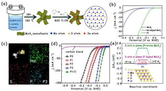 Moreover, Xue et al. successfully doped P into the original MoS2 and adjusted the P doping concentration (Figure 3c) [36]. After the MoS2 was doped with P atoms, both the onset overpotential and overpotential decreased gradually. Notably, the P-doped MoS2 with the most suitable doping concentration displayed the least onset overpotential of 15 mV and overpotential at 10 mA cm−2 of ~43 mV, while the pure MoS2 nanosheets only exhibited an onset overpotential of 88 mV and overpotential at 10 mA cm−2 of 140 mV, indicating that the doping of P atoms can usefully enhance the HER activity of MoS2 nanosheets (Figure 3d). By combining calculations with experiments, the authors demonstrate that P dopants serve as the new active sites in the basal plane of MoS2 with the ∆GH* of 0.04 eV, which is comparable to that of Pt (Figure 3e). Very recently, Zhou et al. reported the incorporation of oxygen into the MoS2/Mo mesh (MoS2/MM) by a facile electrochemical anodic activation process [35]. The doping of O atoms produced more active sites in MoS2 with tuned ∆GH*, thus possessing much a better HER activity than that of the initial MoS2/MM. This electrochemical activation method has also been successfully employed to modify MoSe2 and MoP.