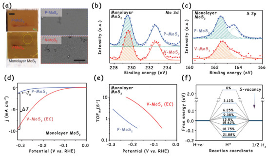 Although the plasma treatment is very efficient for the introduction of S vacancies into the basal plane of MoS2, this technology usually requires high-pressure synthesis conditions and is, therefore, not energy-saving enough [37,39]. Tsai et al. introduced a scalable route to generate S vacancies on the MoS2 basal plane using electrochemical desulfurization (Figure 5a–c) [17]. By changing the applied desulfurization potential, the content of S vacancies and the resulting HER activity can be easily varied. The experiment and calculation results showed that the optimal hydrogen adsorption free energy corresponds to an S-vacancy concentration between 12.5% and 15.62%, which results in a high per-site turnover frequency (TOF) (Figure 5e,f). However, it is worth noting that the desulfurized sample with vacancies (V–MoS2) had a limited total activity (Figure 5d), which must be optimized before replacing Pt-based catalysts for practical applications.