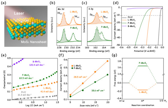 Recently, our group first adopted the laser ablation in liquid (LAL) technique to introduce plentiful S vacancies on the basal plane of 2H-MoS2 nanosheets under ambient conditions (Figure 6a) [7]. The XPS spectra showed that the peak area ratio of S/Mo for the laser-treated MoS2 was smaller than that for pristine MoS2, indicating a S-vacancy concentration of about 8% in the laser-treated MoS2 (Figure 6b,c). Eventually, the laser-treated sample exhibited a low overpotential of 178 mV to reach 10 mA cm−2 and a Tafel slope of 41.4 mV dec−1, both of which far exceed those of pristine MoS2 (Figure 6d,e). We attribute the excellent HER performance to the additional active sites on the basal plane and the optimal ∆GH* (Figure 6f,g).