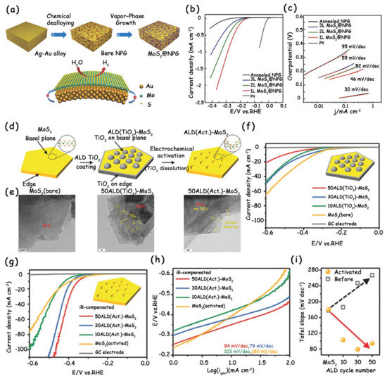 Recently, Kim’s group combined the atomic layer deposition (ALD) and electrochemical etching techniques, which are commonly used in the industry, to activate the inert basal planes of commercial bulk MoS2 [41]. In detail, they first deposited titanium dioxide (TiO2) islands on the MoS2 basal planes via ALD, which were then leached out using the in situ electrochemical activation method to form strains (Figure 7d). The electrocatalytic HER activities of these catalysts were tested using a three-electrode cell system in an aqueous 0.5 M H2SO4 solution (Figure 7f,g). As shown in the LSV curves (Figure 7g) and Tafel slopes (Figure 7h,i), the more cycles of ALD coating, the higher the catalytic performance of the activated MoS2. The authors attributed the reason to the more local surface distortions created on the MoS2 basal planes (Figure 7e).