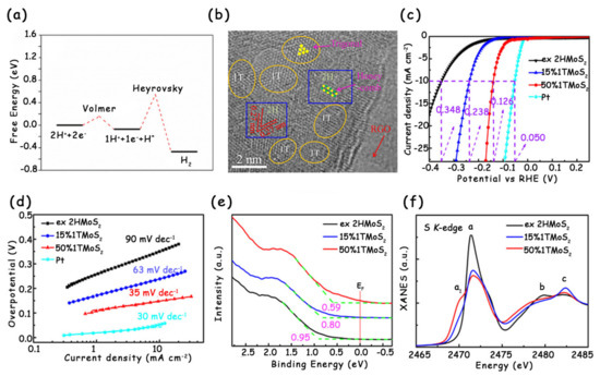 (a) Free energy diagram for the Volmer–Heyrovsky route on 1T-MoS2 at the electrode potential of –0.22 V vs. NHE (~25% surface H coverage). (b) HRTEM image of the 1T-2H MoS2 with a 1T content of 50%. (c) LSV curves and (d) corresponding Tafel slopes of ex-2H MoS2, 15% 1T MoS2, 50% 1T MoS2, and Pt. (e) Ultraviolet photoelectron spectra (UPS) and (f) S K-edge X-ray absorption near-edge structure (XANES) spectra of ex-2H MoS2, 15% 1T MoS2, and 50% 1T MoS2 nanosheets. (a) has been reproduced with permission from Ref. 46. Copyright © 2016, American Chemical Society. (b–f) have been reproduced with permission from Ref. 50. Copyright © 2017, American Chemical Society.
