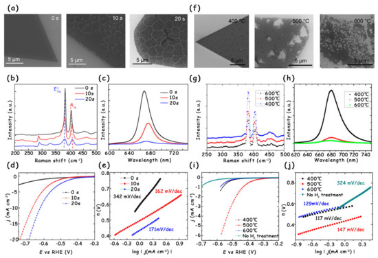 Another effective approach for increasing edge active sites is the introduction of holes into MoS2 by hydrogen annealing, and the number of holes can be readily adjusted by changing the annealing temperature [16]. When the annealing temperature is set to 400 °C, no obvious morphology change is observed on the single-layer MoS2. Once the annealing temperature increases to 500 °C, the MoS2 begins to be etched and some small triangular holes appear. Nevertheless, when the annealing temperature rises to 600 °C, most of the MoS2 is decomposed because of the formation of high-density triangular holes (Figure 11f). The Raman and PL spectra clearly show the reduction in peak intensity after hydrogen annealing treatment, indicating the increase in defects and edge active sites in monolayer MoS2 (Figure 11g,h). To establish the relationship between the HER performance and the number of holes, the authors tested the LSV curves of MoS2 under different annealing temperatures. With the increase in the number of holes, the HER activity first improved and then decreased. The MoS2 annealed under 500 °C possessed the lowest onset overpotential (~300 mV) and largest current density, both of which are far better than those of the original MoS2 (Figure 11i,j). The reason the performance of MoS2 under 600 °C is worse than that of MoS2 under 500 °C is mainly ascribed to the fact that the left MoS2 with too many defects is not stable.