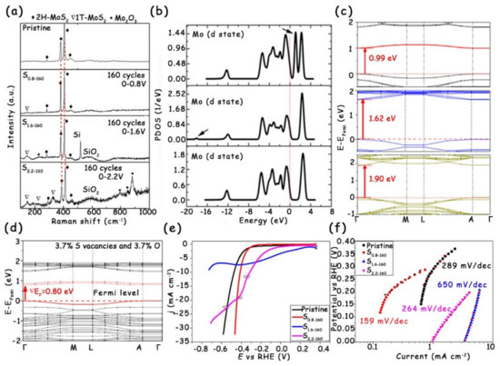 Wong et al. reported that the electrochemical etching via applying a positive voltage can form S vacancies in the multilayer 2H-MoS2 nanosheets, which act as electron donors to promote the 2H/1T phase transition [59]. As shown in the Raman spectra (Figure 12a), the pristine 2H-MoS2 presents four main characteristic peaks at 282, 380, 406, and 450 cm−1 that correspond to the E1g, , and A1g vibration modes and the longitudinal acoustic phonon mode of 2H-MoS2, respectively. Once the positive potential is applied to treat the original 2H-MoS2, several new vibration modes can be observed at 151, 221, and 326 cm−1, which are attributed to the J1, J2, and J3 peaks of the 1T phase. In addition, with the improvement in the applied potential, the above three characteristic peaks become more and more obvious, indicating the increase in 1T phase content. However, it is worth noting that for the S1.6-160 and S2.2-160 samples, there appear high-frequency vibration modes at 794, 847, and 880 cm−1, which are related to aqueous MoO3. The strength of MoO3 for the S2.2-160 is higher than that for the S1.6-160, confirming the increased O doping level in the S2.2-160 sample. Besides, the authors further combined the theoretical calculation to analyze the electronic energy band structure of all MoS2 samples (Figure 12b). The band gap of 2H-MoS2 with the 1T phase and O doping is 0.80 eV, which is narrower than those of pristine 2H-MoS2 (1.90 eV), pure O-doped 2H-MoS2 (1.62 eV), and 2H-MoS2 with the 1T phase (0.99 eV) (Figure 12c,d). Therefore, the synergistic effect of the 1T phase and O doping can improve the electrical conductivity of MoS2 nanosheets, eventually leading to the significantly reduced overpotential and Tafel slope for HER electrocatalysis (Figure 12e,f).