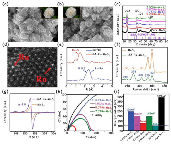 Doping can induce the partial phase transition and generation of S vacancies, which adjust the local electronic structure of MoS2 and form the new interstitial states, thus improving the electronic conductivity [33]. Recently, Cao’s group successfully modified MoS2 nanosheets via single-atom Ru doping using a simple one-step impregnation method [33]. The SEM images (Figure 13a,b) and XRD patterns (Figure 13c) show that both morphology and crystal structure after Ru doping are similar to those of original MoS2, indicating that the modified strategy does not cause excessive damage to MoS2. The authors further combined the high-angle annular dark-field scanning transmission electron microscopy (HAADF-STEM) image (Figure 13d) and Fourier-transformed R-space spectrum (Figure 13e) to analyze the existence form of Ru in MoS2. All the above characterization results together prove that Ru is single-atomically anchored in the MoS2 plane by replacing Mo sites and coordinating with S atoms. Interestingly, in comparison with the original MoS2 consisting of the pure 2H phase, there contain both 2H and 1T phases in the single-atom Ru-doped MoS2 (SA-Ru-MoS2), as presented in the Raman spectra (Figure 13f). In addition, the paramagnetic signal detection of electron spin resonance confirms that abundant S vacancies exist in the SA-Ru-MoS2 (Figure 13g). Due to the co-existence of the 1T phase and S vacancies induced by Ru doping, all the SA-Ru-MoS2 with different Ru doping concentrations exhibit much lower charge transfer resistance (Rct) values than those of the original MoS2 (Figure 13h). Especially for the SA-Ru-MoS2 sample with 5.0% Ru doping, it possesses the best charge transfer property. To deeply understand the effect of single-atom Ru doping on the conductivity of SA-Ru-MoS2, the authors also performed electronic structure analysis. The S vacancies and single-atom Ru doping together generate the interstitial states near the Fermi level, which result in increased electrical conductivity. Ultimately, the 5.0%-Ru-MoS2 only requires a low overpotential of 76 mV to reach the HER current density of 10 mA cm−2 (Figure 13i).