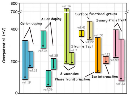 To visually compare the effect of various modification strategies on the HER activity enhancement of original MoS2, the overpotentials at 10 mA cm−2 before and after modification are given in Figure 14.