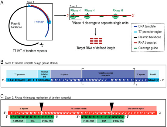 Schematic representation of the reported protocol. (A): (left) Tandem transcription from a linearized plasmid template with T7 RNA polymerase (T7RNAP) and (right) successive cleavage of the transcript to target length RNA by RNase H, directed by a chimeric DNA guide. (B): Detailed schematic of the tandem template, which starts with the viral T7RNAP promoter, an initiation sequence. The target sequence (dark blue, example here is 20 nt length) is repeated n number of times. The repeats flanked by a 5′- and 3′-spacer sequences consisting of the last eight and first four nucleotides respectively to allow for removal of the initiation and restriction sequences from the first and last repeat unit. (C): Hybridization of the tandem transcript (red) and the chimeric cleavage guides (green). RNase H cleaves the RNA opposite the DNA 5′-end. The 2′-OMe RNA flanks increase specificity by enhancing the binding affinity of cleavage guide to the target RNA.