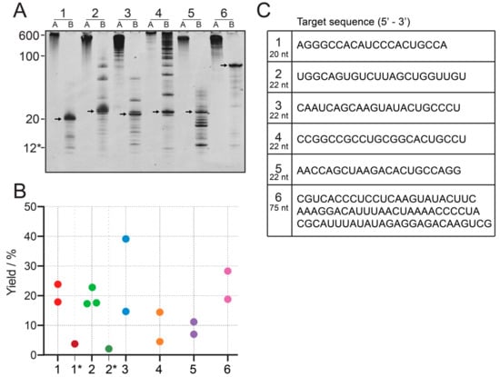 Yield comparison between 6 different constructs. (A): IVT (lanes A) and cleaved tandem transcription (lanes B) for six constructs. 1: 20 nt, 2–5: 22 nt, 6: 75 nt. To allow comparison between constructs, the same volume of reaction has been loaded onto all lanes. The 12* label refers to the chimeric cleavage guide of construct 1, consisting of 4 DNA nucleotides and 8 2′-OMe nucleotides. (B): Yield quantification from IE HPLC for the six constructs, including transcription from single-repeat template for construct 1 and 2, labeled 1* and 2* using an external standard curve. Individual points denote technical replicates. Numbers can be found in the Supplementary Information (Table S3). (C): RNA sequences of all six constructs.