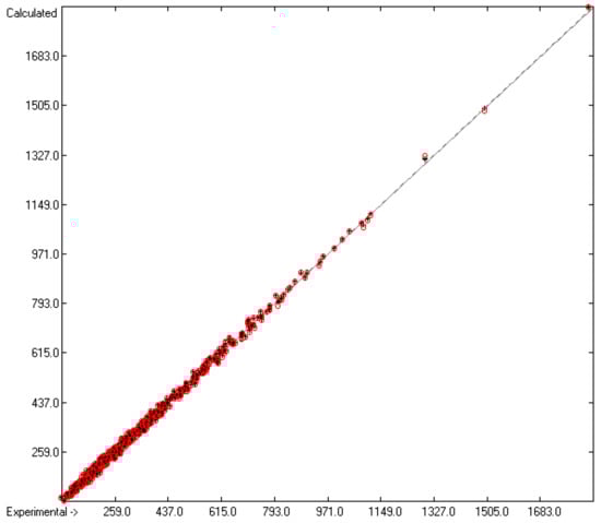 Correlation diagram of the Cp(sol,298) data (in J/mol/K). The cross-validation data are superimposed as red circles. (n = 734; r2 = 0.9915; q2 = 0.9874; regression line: intercept = −0.0999; slope = 0.9984).