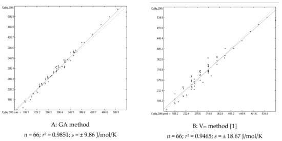 The distinctly better conformance of the predicted with the experimental Cp(liq) values in comparison with earlier literature references is essentially based on three primary reasons. The first one is the refinement of the molecules’ description itself by the most detailed classification of group notations, which is precluded on principal to the Vm method [1], but requires a large number of atom groups and consequently a large amount of experimental data for their parametrization. The second reason originated from an observation made in [1], namely that the heat capacities of primary, and less so, of secondary alcohols have notoriously been overestimated by the Vm approach. These systematic deviations can be seen in Table 4, where the experimental Cp(liq,298) data and the predicted values of both the present GA and Vm method of the corresponding alkanols, encompassing saturated alkyl mono-, di- and polyols, are compiled for comparison. In order to overcome this deficiency, the alcohols have therefore been subdivided as described in Section 2 into the three subclasses primary, secondary, and tertiary alcohols. This additional separation indeed had a dramatically positive effect on the entire alcohols class, demonstrated by the comparison of the correlation diagrams of Figure 3. The MAPD values shown at the bottom of Table 4 confirm that the GA method on average produces distinctly lower deviations from experimental values than the Vm approach.