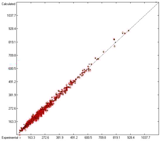 Correlation diagram of the Cp(liq,298) data (in J/mol/K). The cross-validation data are superimposed as red circles. (n = 1111; r2 = 0.998; q2 = 0.9975; regression line: intercept = 0.7993; slope = 0.9977).