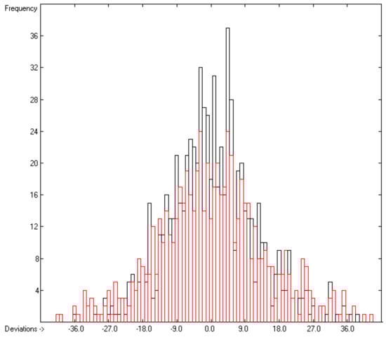 Histogram of the liquid heat-capacity data. The deviations are in J/mol/K. The cross-validation data are superimposed as red bars. (S = ± 9.19; Experimental value range: 81.92–1849 J/molK).