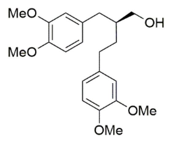A subclass of lignans called norlignans are dimers composed of a phenylpropane unit and a phenylethane unit coupled through a β-β′ linkage (Figure 1). The prefix “nor” indicates the lack of one or more carbon in the parent skeleton, and the term 9-norlignan is used when the lignan structure lacks C-9 (or γ carbon). As lignans, norlignans are also found in plants, having a range of biological activity [8,9].