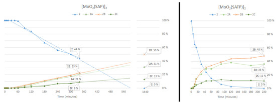 To further investigate this, reaction kinetic studies were performed with substrate 2 (14.5 mM) in toluene, using 0.5 mol% dimeric Mo(VI)-precatalyst (i.e. 1% mol Mo) and 5 equivalents of TBHP (70 wt% in water) at 80 °C. The reaction was followed by GC-MS using dimethyl-dihydroimperanene as internal standard (Figure 4). Samples were taken at specific time intervals and dried in a vacuum. Derivatization of the samples was done using tetramethyldisilazane and chlorotrimethylsilane in pyridine prior to GC-MS analysis [27]. The results showed that the reaction catalyzed by [MoO2(SATP)]2 was faster (as mentioned previously), with a quantitative conversion reached after 3 h 40 min (Figure 5). For comparison, at 3 h 40 min, the [MoO2(SAP)]2-catalyzed reaction showed a conversion of less than 50% and, calculated from the trend of the reaction rate, a quantitative conversion was reached after approximately 9 h 30 min. The rate was 2.6 times slower than the [MoO2(SATP)]2-catalyzed reaction. For both catalysts, the final reaction mixture gave products 2A, 2B and 2C in roughly 3:5:1 ratio. Quantification using GC analyses showed a total conversion to products 2A, 2B and 2C at around 95%, for both reactions. Quantification using NMR analysis, however, indicated that the total yield (2A, 2B and 2C) was around 70% (calculated from the ratio of integrals in the 1H spectrum). This difference may be explained by the fact that signal intensity in the total ion chromatogram is not fully quantitative, due to a different degree of ionization for the products. As each product was not quantitatively calibrated on GC, quantification using NMR seemed to be more reliable.