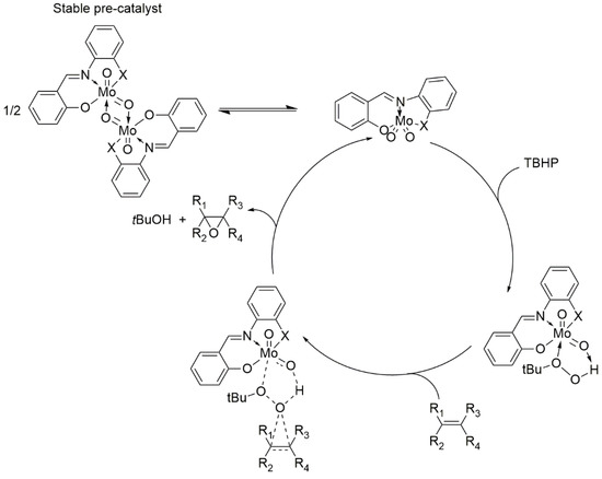 The dimeric Mo(VI)-complex (pre-catalyst), with salicylideneaminophenolato ([MoO2(SAP)]2) (X = O) or salicylideneaminothiophenolato ([MoO2(SATP)]2) (X = S) tridentate ligands and the formation of the monomeric active catalysts. The active [MoO2L] species is coordinated to TBHP followed by Bartlett-type epoxidation of olefins [19].