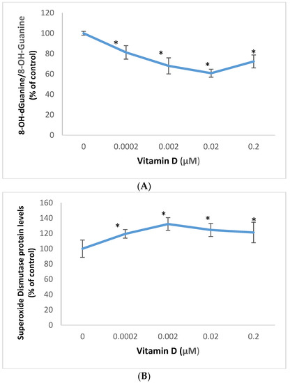 Relative to the control (100%), vitamin D at 0.0002, 0.002, 0.02, and 0.2 μM significantly inhibited oxidative DNA/RNA damage to 81%, 68%, 61%, and 72% (p < 0.05) (Figure 1A); and significantly stimulated superoxide dismutase protein levels to 119%,132%,125%, and 121% (p < 0.05) (Figure 1B), in melanoma cells.