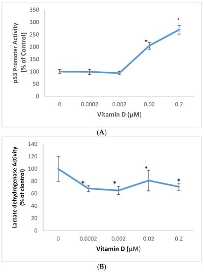 Vitamin D at 0.02, and 0.2 µM significantly stimulated p53 promoter activity to 205%, and 270% of control (100%) in melanoma cells (p < 0.05) (Figure 2A). Relative to the control (100%), vitamin D at 0.0002, 0.002, 0.02, and 0.2uM significantly inhibited membrane damage to 68%, 65%, 81%, and 71% of control, in melanoma cells (p < 0.05) (Figure 2B)