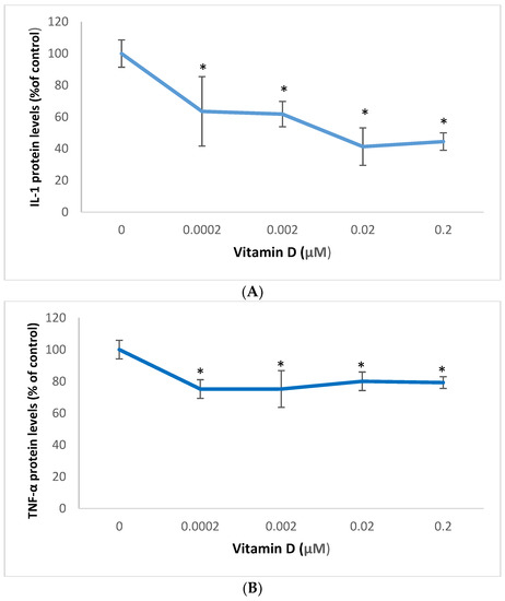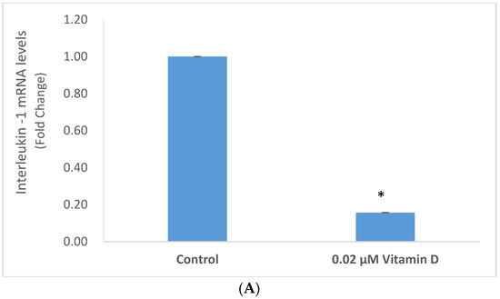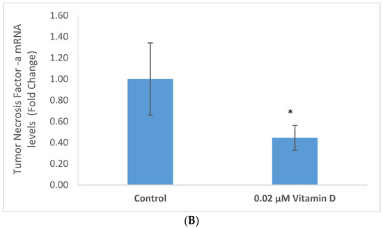 Vitamin D at 0.02 µM significantly inhibited the mRNA levels of IL-1 and TNF-α to 0.16 and 0.45 fold, respectively, of control (p < 0.05) (Figure 4A,B).
