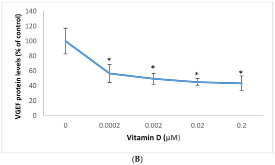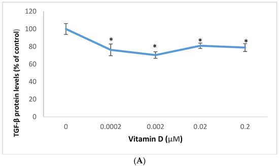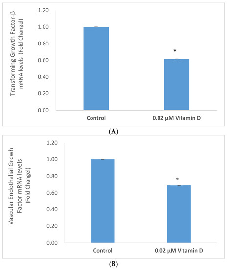 Vitamin D at 0.02 µM significantly inhibited the mRNA levels of TGF-β and VEGF to 0.62 and 0.69 fold, respectively, of control (p < 0.05) (Figure 6A,B).