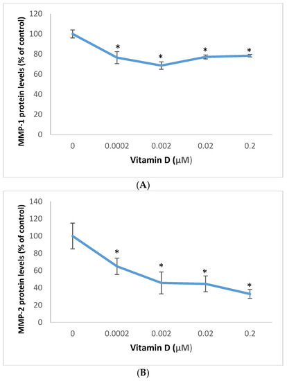 Relative to the control (100%), vitamin D at 0.0002, 0.002, 0.02, and 0.2 µM significantly inhibited MMP-1 protein levels to 76%, 69%,77%, and 78% of control (p < 0.05) (Figure 7A); and significantly inhibited MMP-2 protein levels to 65%, 46%,45%, and 33% of control (p < 0.05) (Figure 7A), in melanoma cells.