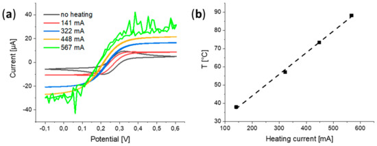 (a) Cyclic voltammograms (CVs) of a flattened Pt wire (width, 70 µm) in 5/5 mM ferro/ferricyanide solution with 1.0 M KNO3 as supporting electrolyte. The applied alternating current (AC) at the wire varied between the CVs. Scan rate: 100 mV/s. (b) Plot of heating currents applied at the wire during CVs and their respective temperatures, obtained from half-wave potentials.