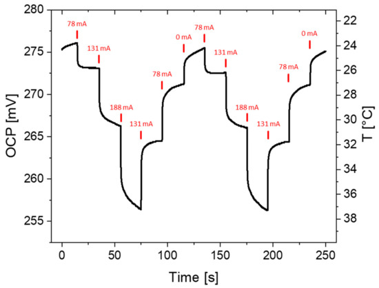 Open circuit potential (OCP) measured over time at a flattened wire substrate in a solution of 5/5 mM ferro/ferricyanide and 1.0 M KCl. The applied AC was varied in time intervals of 20 s (indicated by red marks), and the change in OCP with the corresponding temperature was monitored.
