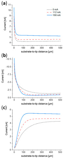 For the electrochemical characterization of surfaces, scanning electrochemical microscopy (SECM) has become an established technique [20,21,22,23]. Its key component is an ultramicroelectrode (UME), which is scanned across a surface or interface of interest. A variety of measurement modes can be applied, with the most common ones being the feedback, substrate generation/tip collection (SG/TC), and competition modes. In feedback mode, measurements are carried out in a solution containing a redox-active mediator species while a potential is applied at the UME, resulting in conversion of the mediator at a rate that is dependent on the electrochemical activity and topography of the surface of interest. In SG/TC mode, the species converted at the probe is generated at the substrate, with no detectable species present in the bulk solution, resulting in a lower background current. This is a frequently applied measuring mode, e.g., to study corrosion processes [24,25,26]. In competition mode, the same potential is applied to probe and substrate, enabling the investigation of the catalytic activity of surfaces [27]. Both SG/TC and competition mode suffer from the limitation of a growing diffusion layer at macroscopic substrates over time, resulting in poor reproducibility of repeated measurements. To overcome this problem, our group has introduced forced convection into the SECM cell, either by stirring [28] or by a flow of the electrolyte solution [29], resulting in a rapidly established steady-state diffusion layer. In addition, forced convection led to a higher contrast in feedback mode measurements [30].