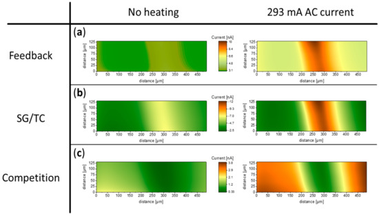 Images of a flattened Pt wire (width = 70 µm) recorded in different SECM measuring modes, with a 25 µm probe without heating (left side) and with heating (right side). (a) Images recorded in feedback mode; (b) and (c) were obtained in SG/TC and competition mode, respectively. E (Probe) = 0.5 V (feedback and competition mode), 0 V (SG/TC mode); E (wire) = 0.5 V (SG/TC and competition mode); scan rate: 100 µm/s, quiet time 20 s. The probe was approached to a tip-to-wire distance of 7 µm.