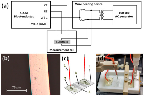 (a) Schematic representation of the experimental setup, showing the electrical connections between the SECM bipotentiostat, AC generator, and measurement cell (scheme adapted from [13]). (b) Micrograph of a flattened Pt wire. (c) Scheme of a hot-wire substrate used in experiments. 1: Copper cables soldered to the Pt wire. 2: Hot glue for insulation of electrical contacts. 3: Flattened Pt wire. 4: Photoresist-covered glass sheet. 5: Glass sheets for wire stabilization. (d) Image of the measurement cell used for SECM measurements, containing electrodes and hot-wire substrate.