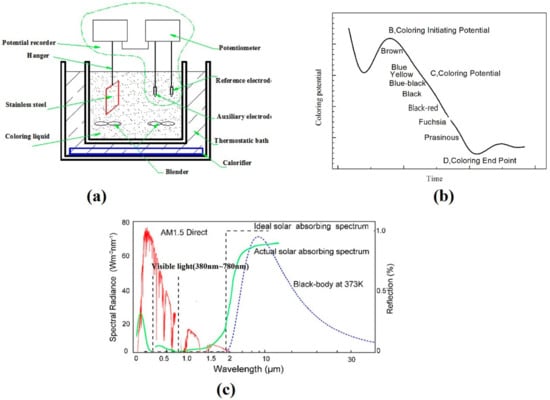 (a) Equipment drawing of chemical coloring; (b) coloring potential-time curves; (c) the spectrum of solar selective.