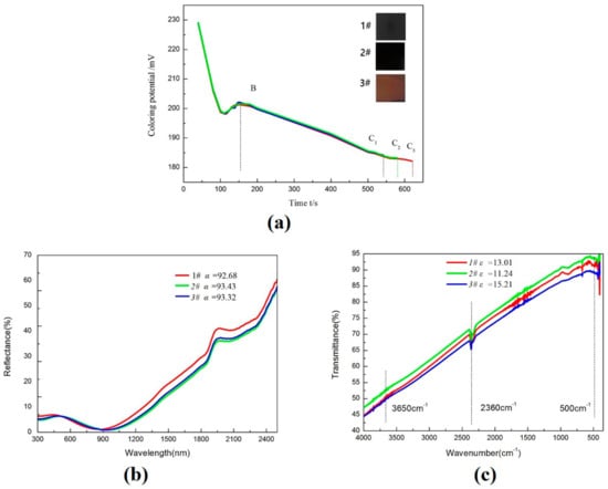 (a) Coloring potential-time curves, (b) UV-Vis-NIR spectra of the coatings by different samples, (c) FTIR spectra of the coatings by different samples.